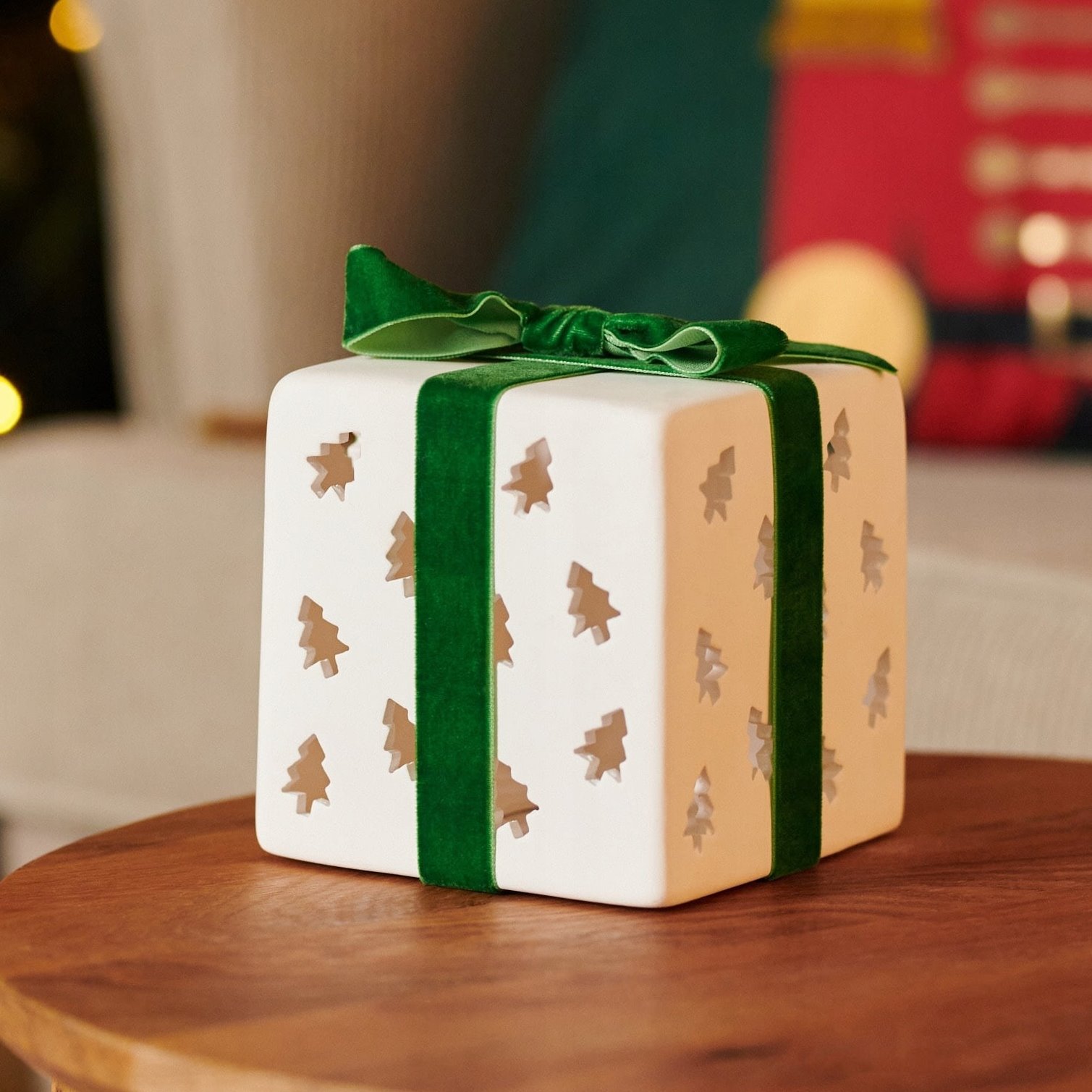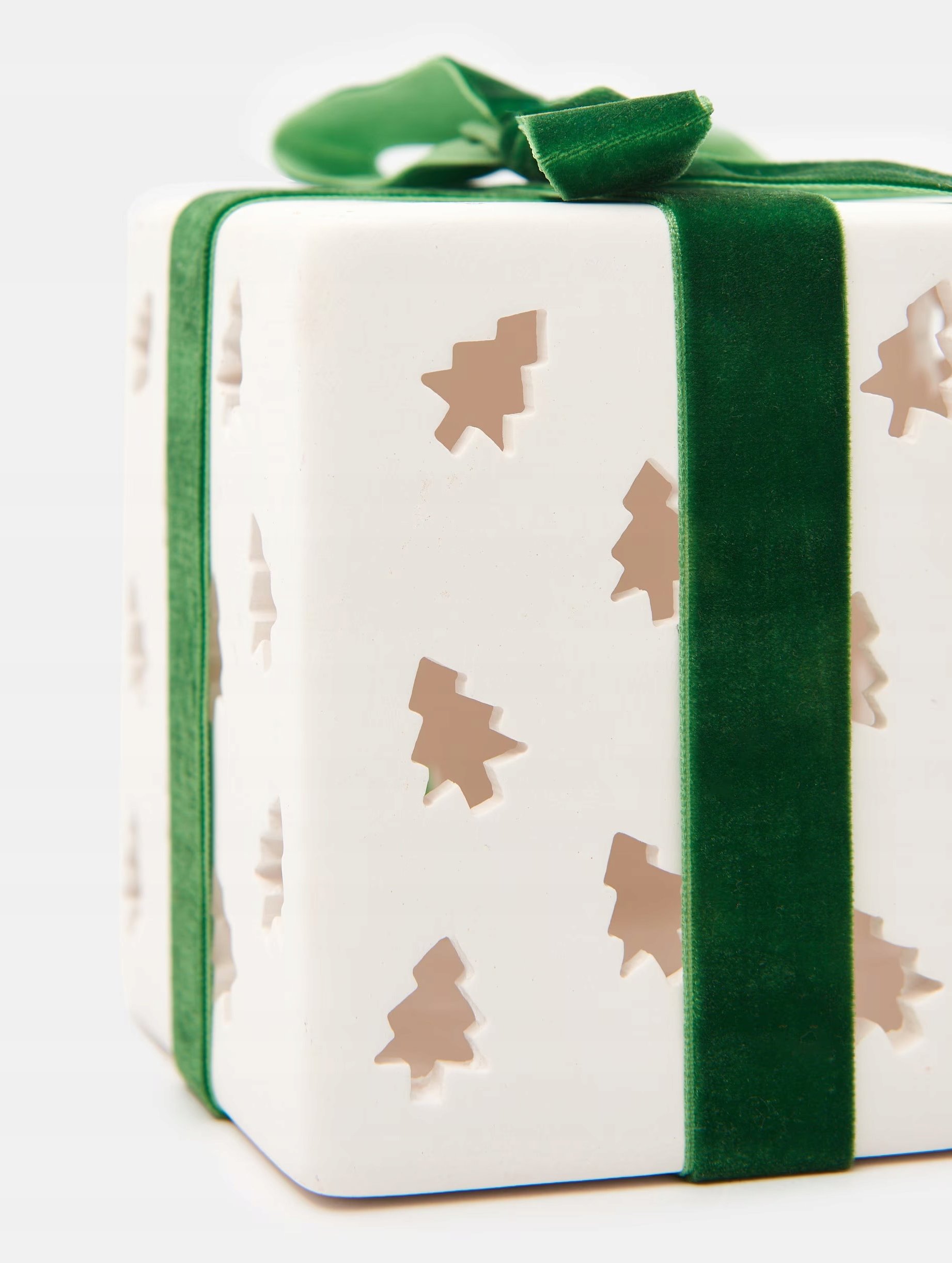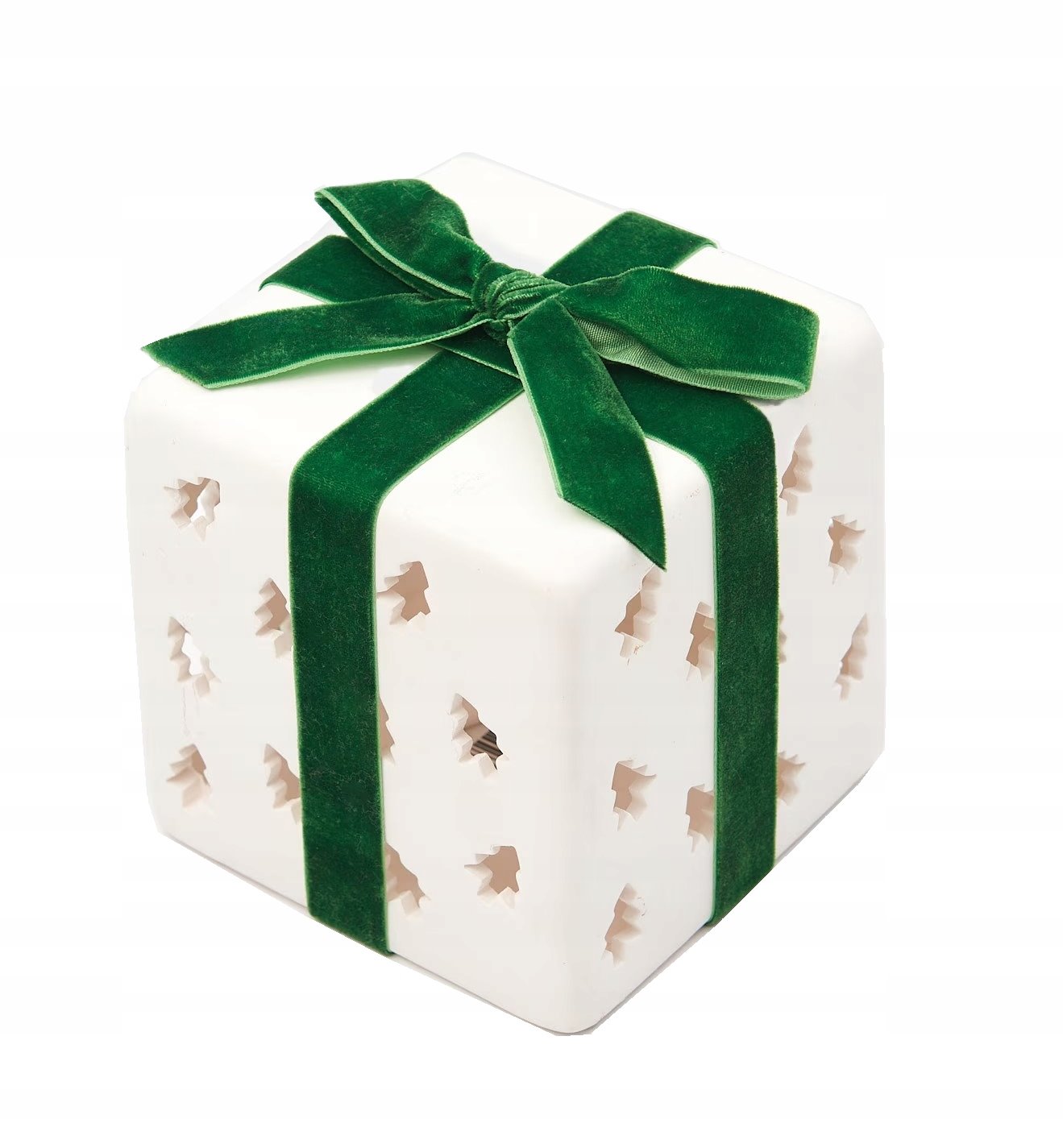 boki sześcianu mają wycięcia w kształcie małych choinek, co dodaje świątecznego charakteru