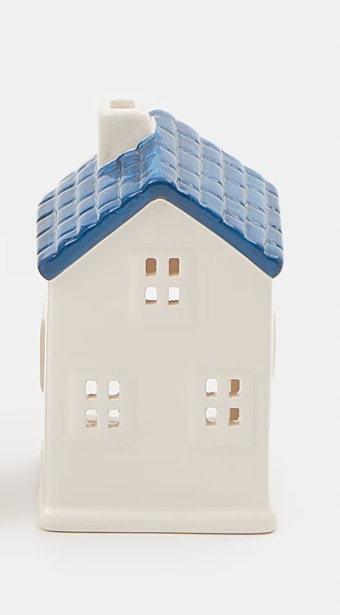 Stojąca dekoracja w kształcie domku, z miejscem na świeczkę. Stwórz wyjątkowy klimat w sypialni czy salonie. Kolor biały, niebieski dach.