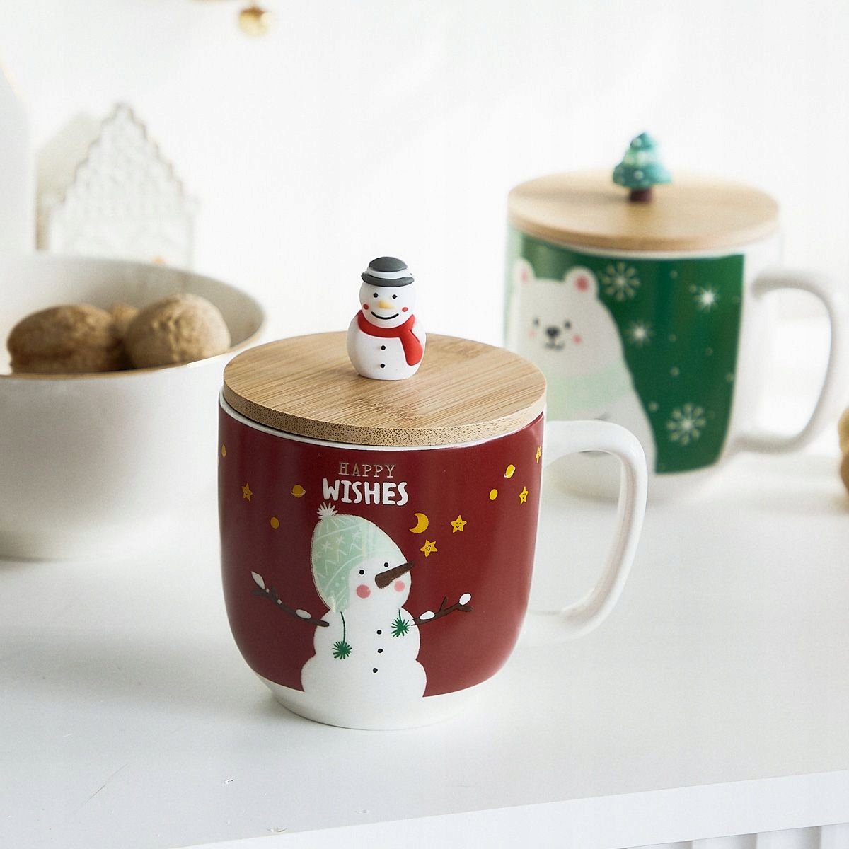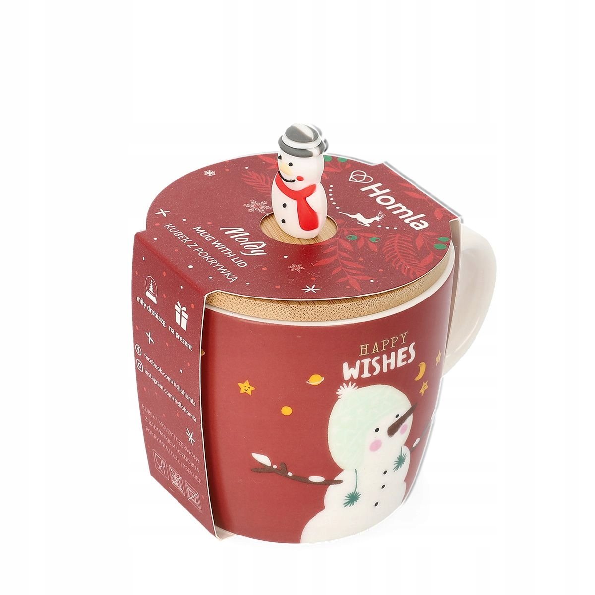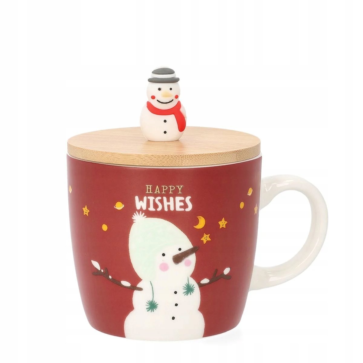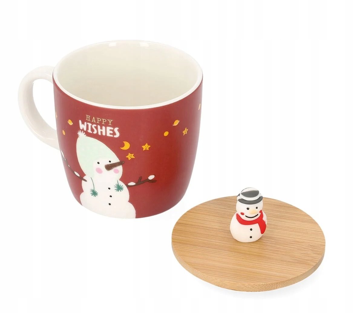 Kubek wyróżnia się pokrywką w drewnianym kolorze, na której w roli uchwytu widnieje bałwanek. Modly został utrzymany w czerwonym odcieniu i dopełnia go postać bałwana. Duże, białe ucho zapewnia wygodne trzymanie go w dłoni.