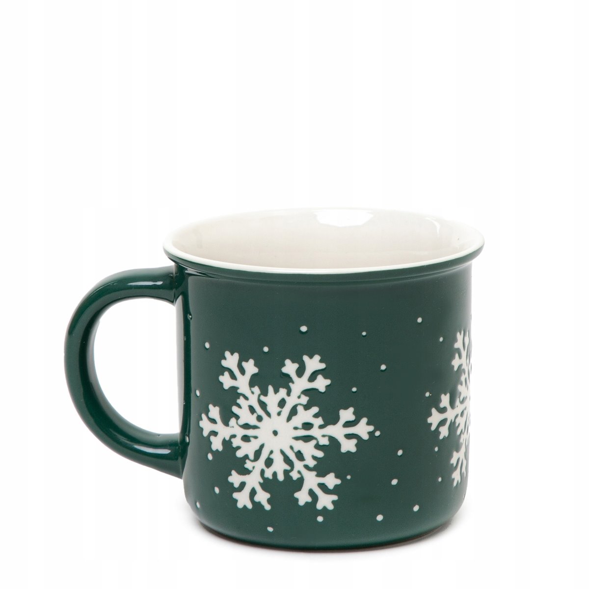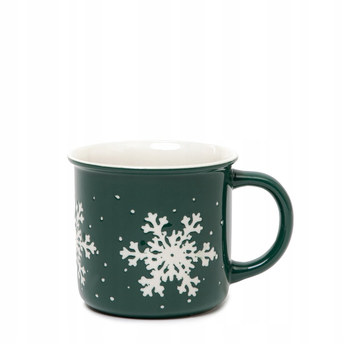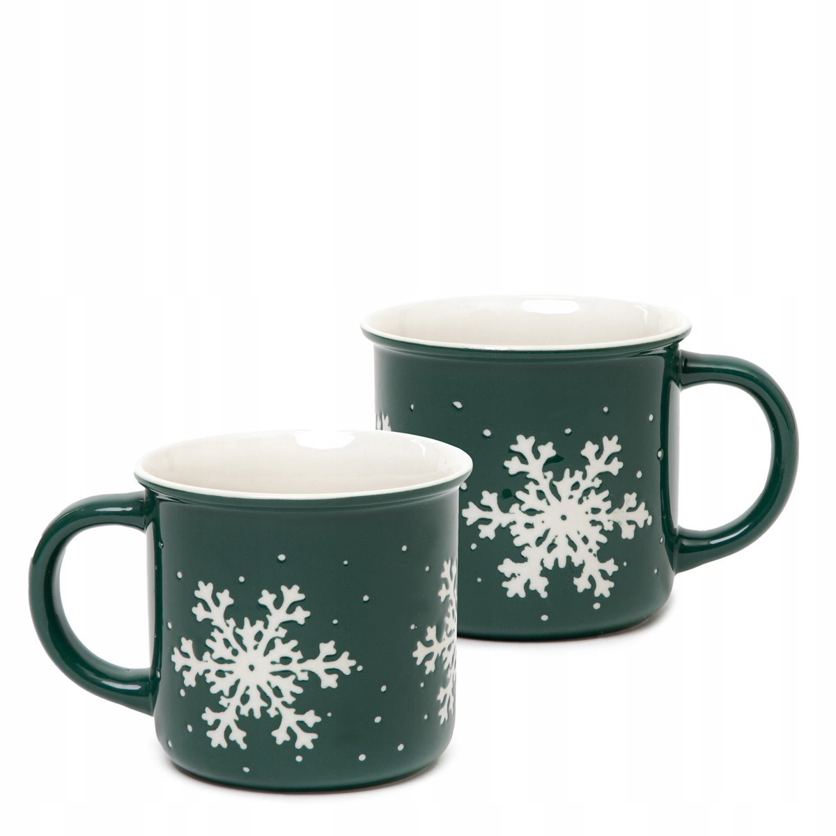 Komplet dwóch kubków TRINKIE zachwycają swoim minimalistycznym designem. Butelkowa zieleń stanowi jednolite tło, pod piękny wzór białej śnieżynki. Od wewnątrz, kubki pomalowano na jasny kolor, co doskonale współgra z całą kompozycją. Ich podstawę oparto na bazie koła, od którego wychodzą proste ścianki.