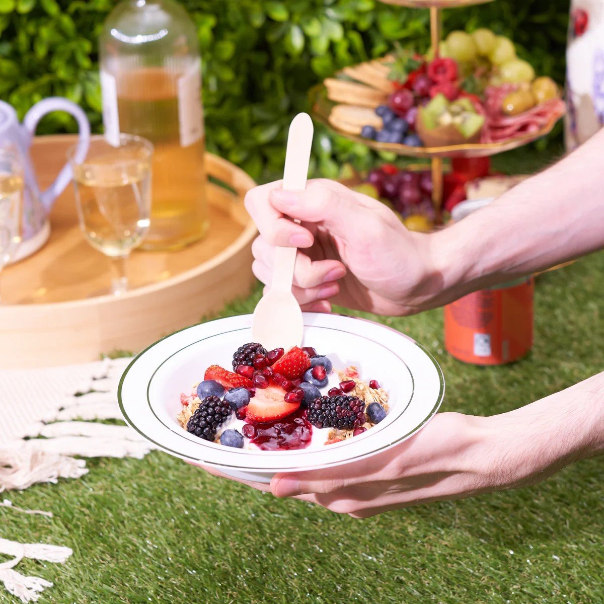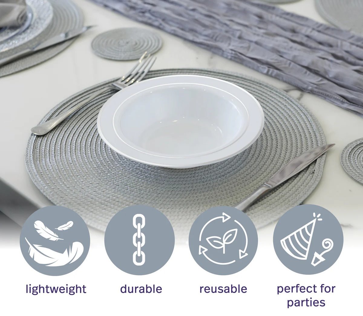 Eleganckie talerze wielorazowe o pojemności 360 ml z ozdobną srebrną obwódką to stylowe i praktyczne rozwiązanie do serwowania zup, sałatek, deserów i przekąsek na każdej imprezie. Dzięki uniwersalnemu designowi łączą estetykę premium z funkcjonalnością codziennego użycia.Przeznaczenie: