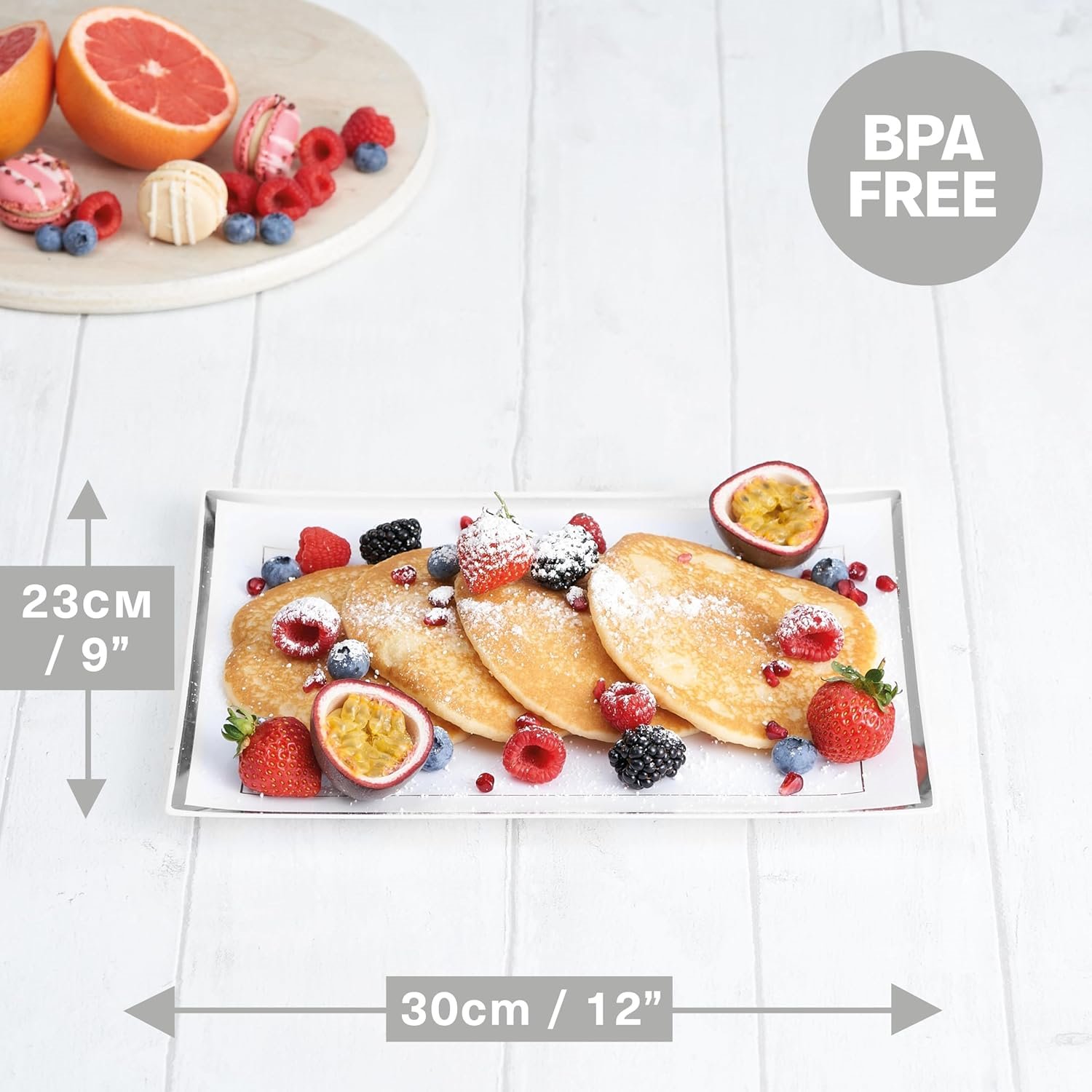 - Zastosowanie – półmisek dobrze sprawdzi się przy różnych okazjach. Jego elegancki wygląd zachwyci gości na imprezach bożonarodzeniowych, urodzinach, przyjęciach typu bufetu, weselnych, przyjęciach ślubnych lub baby shower, Idealny również na zewnątrz – na przyjęciu w ogrodzie