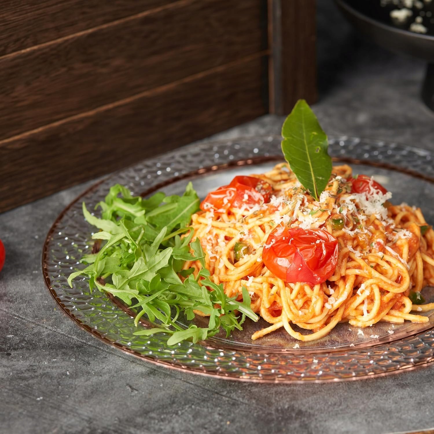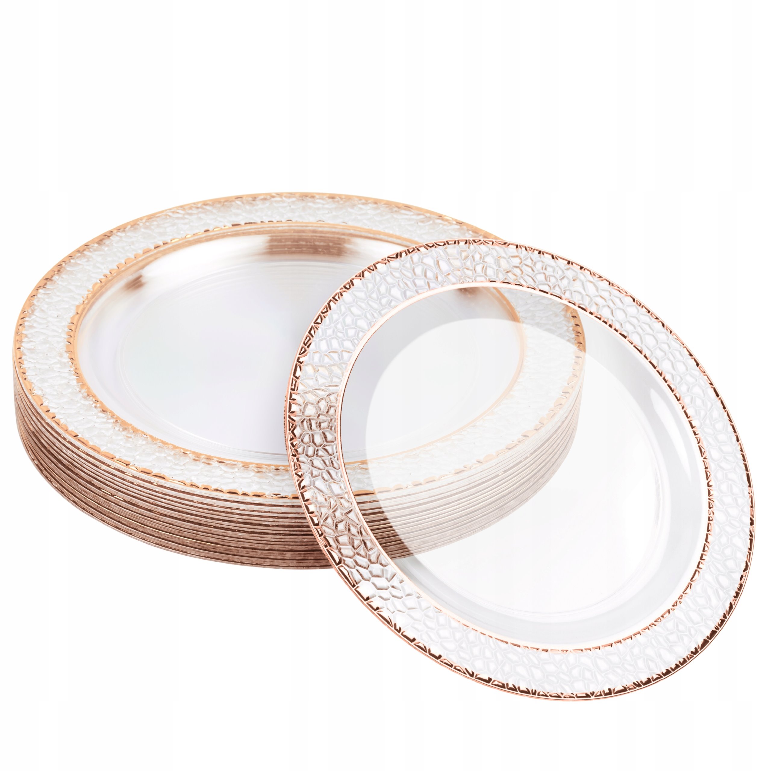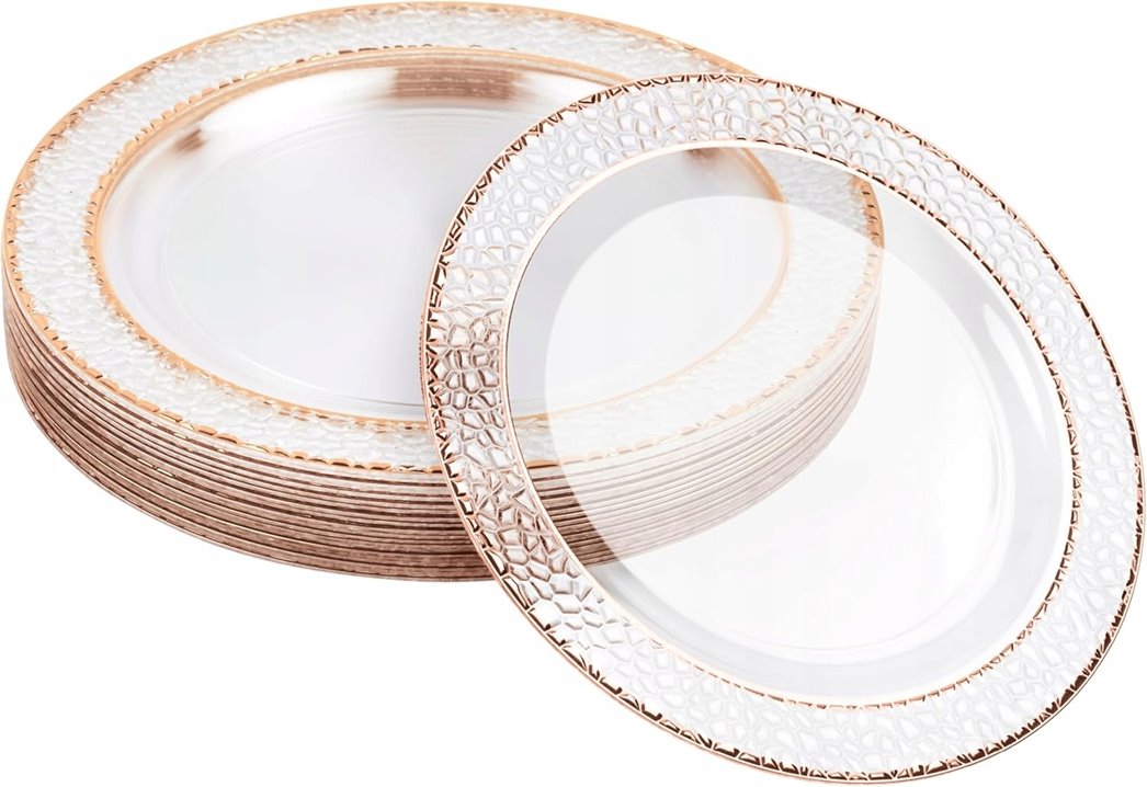 Talerze są przezroczyste z różowo złotym rantem. Obrzeże ma młotkowany charakter.