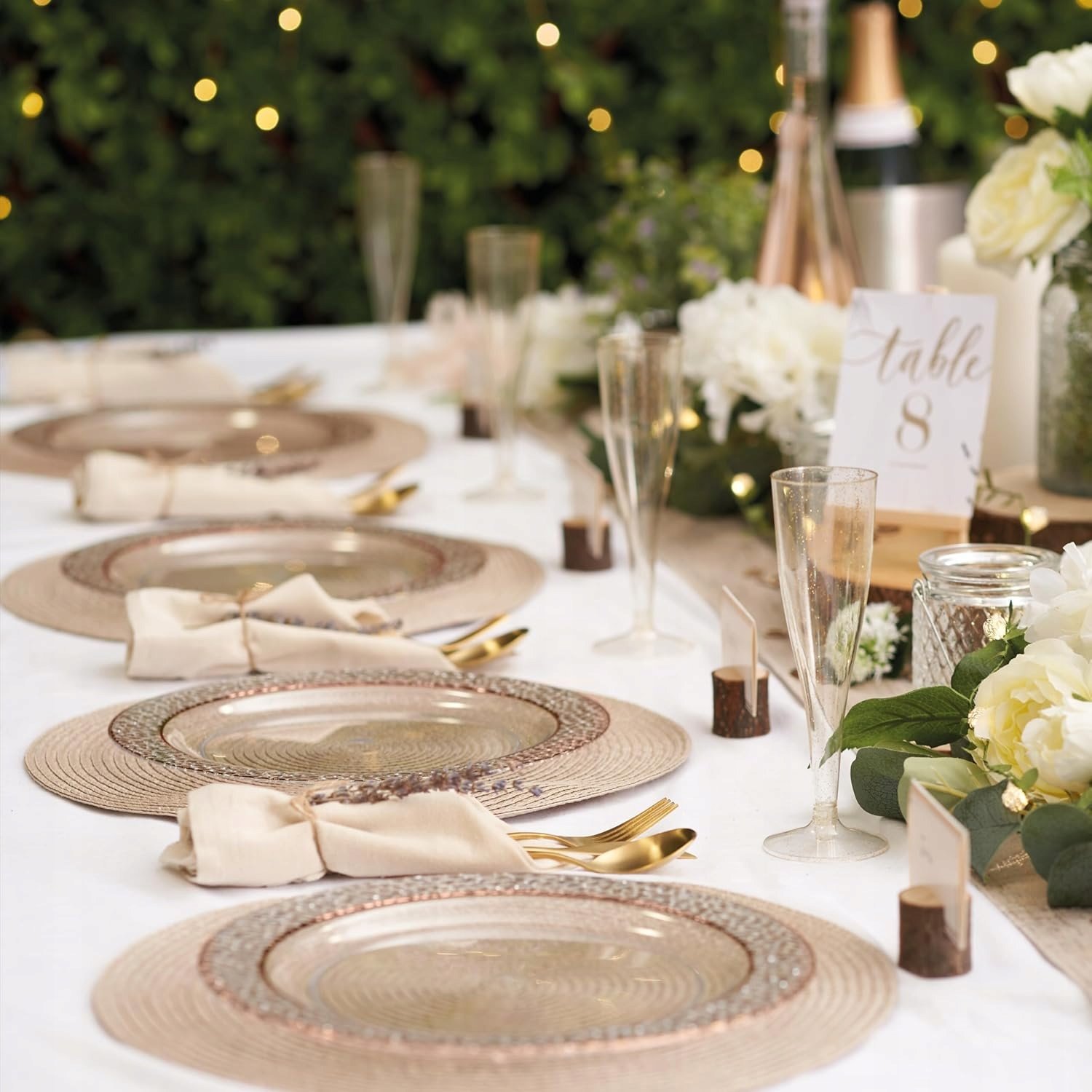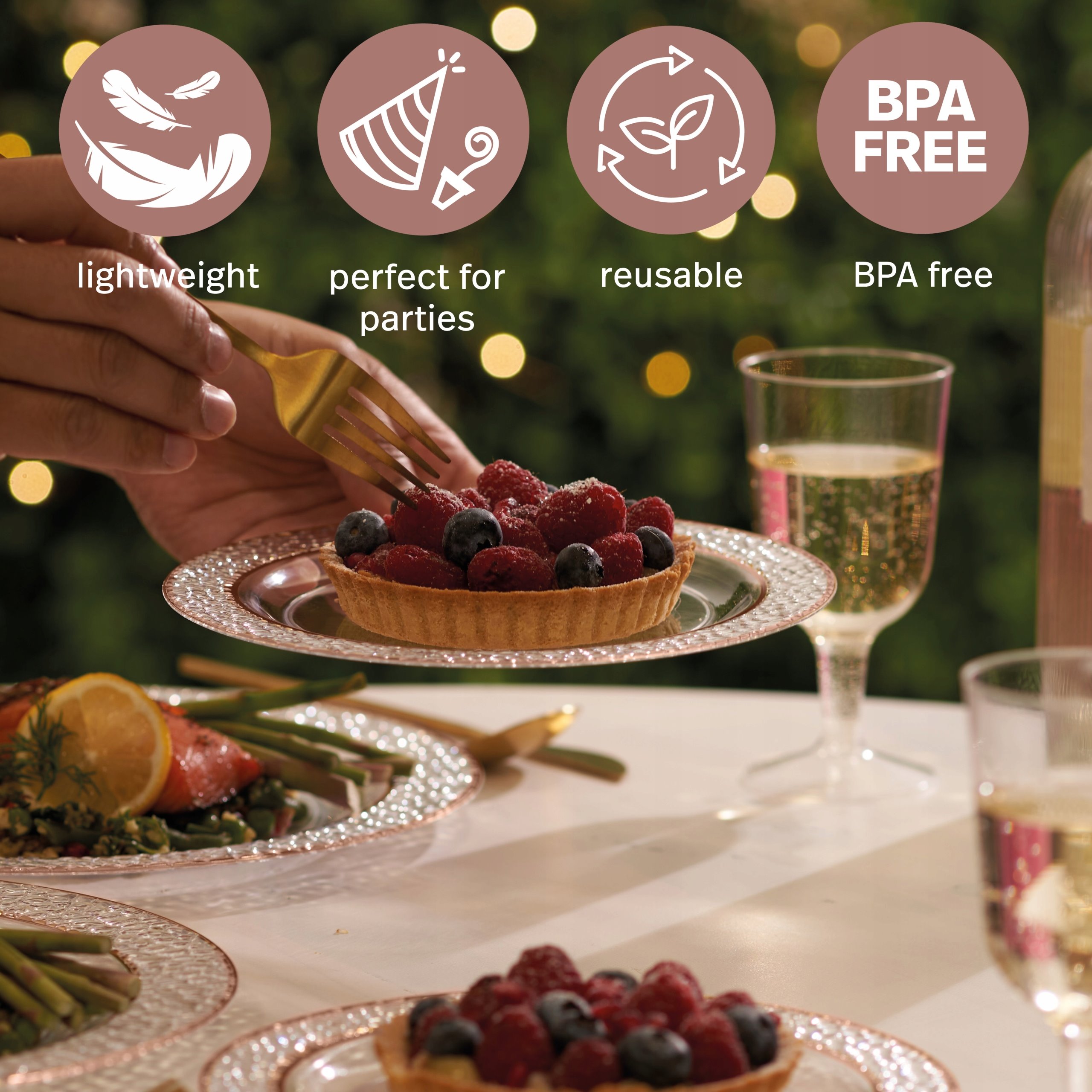 - Zastosowanie – talerze dobrze sprawdzają się przy różnych okazjach. Ich elegancki wygląd zachwyci gości na imprezach bożonarodzeniowych, urodzinach, przyjęciach typu bufet, weselnych, przyjęciach ślubnych lub baby shower, Idealny również na zewnątrz – na przyjęciu w ogrodzie, ekskluzywnym grillu.