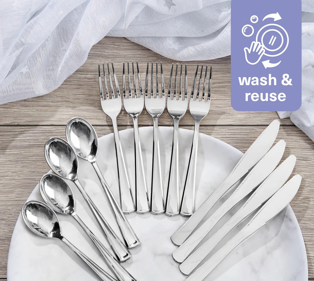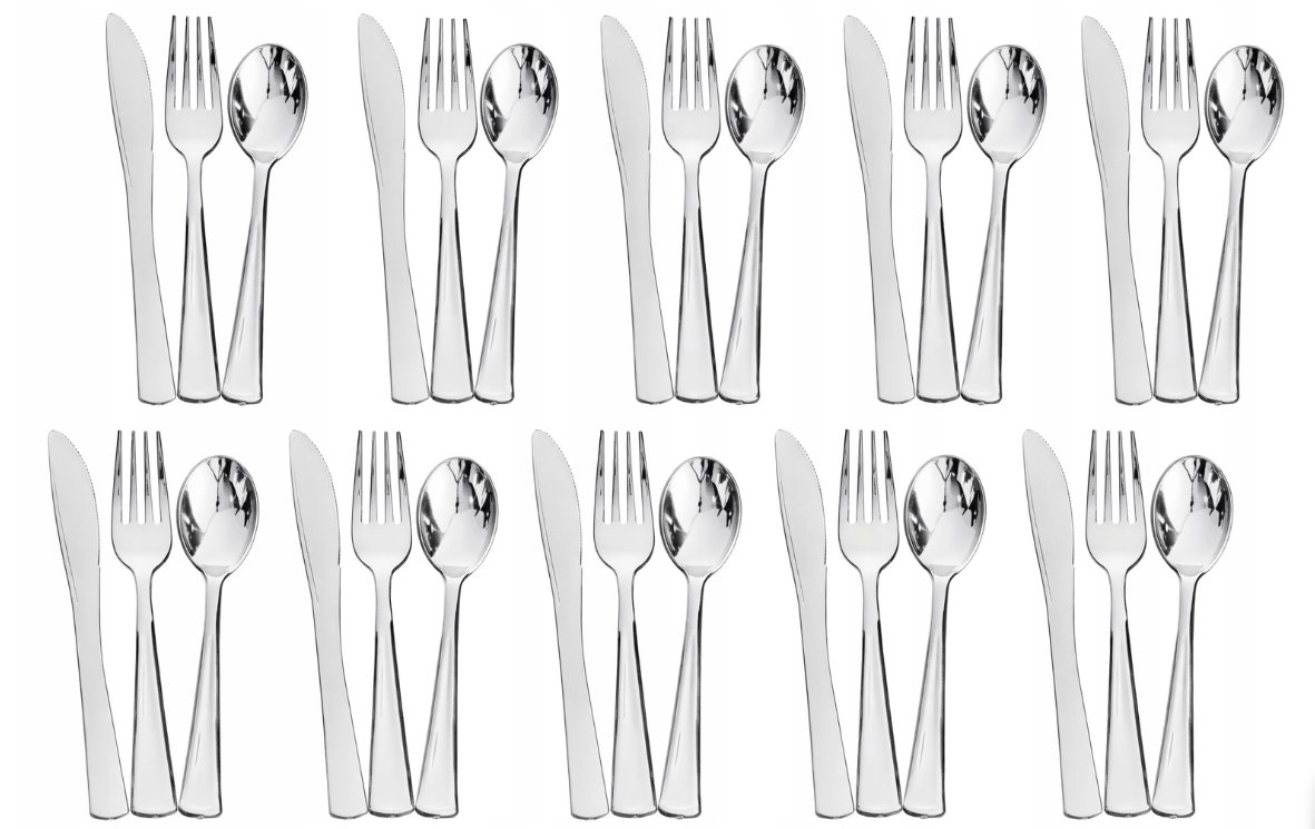 Srebrny zestaw sztućców wielorazowych (30 szt.)Najważniejsze cechy: