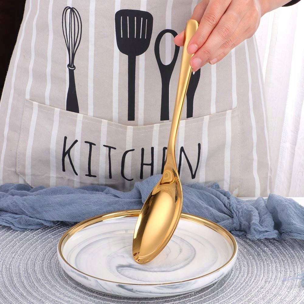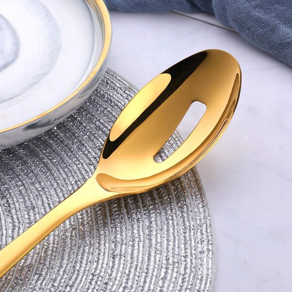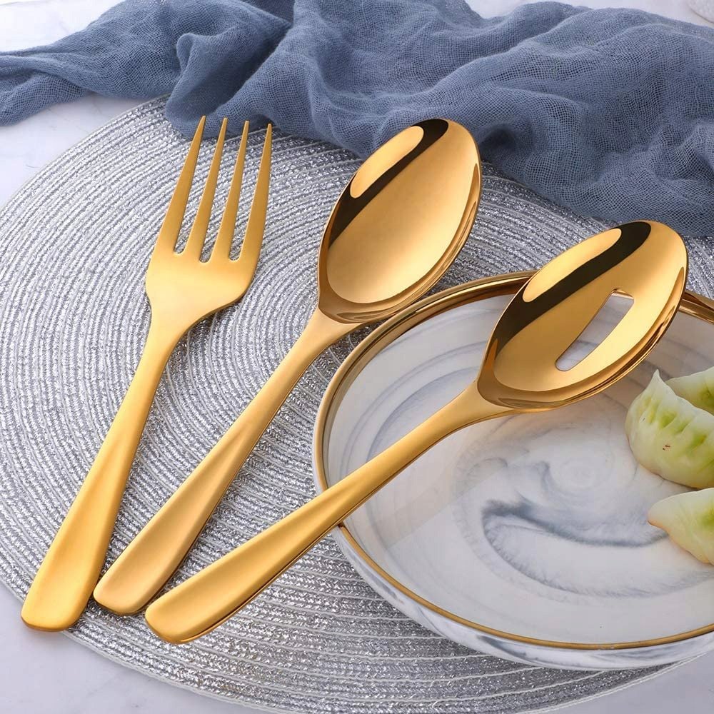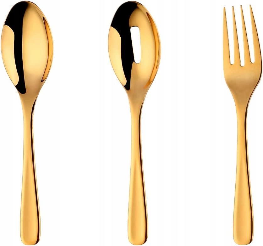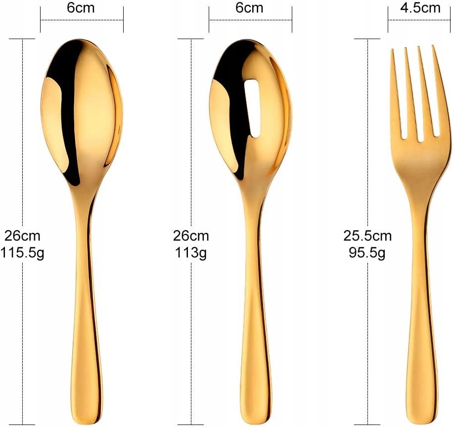 ★ Jeden zestaw zawiera 3 sztuki przyborów kuchennych: 1 szt. łyżeczka do serwowania, 1 x widelec do serwowania, 1 szt. łyżeczka szczelinowa. Kolor: Złoty