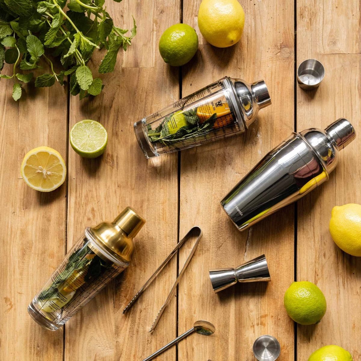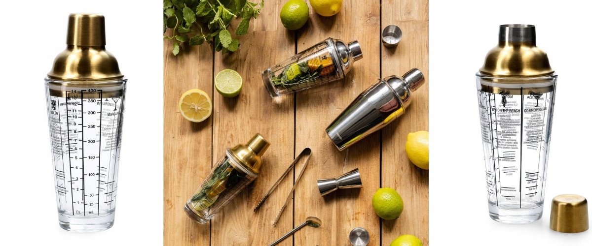 Shaker to produkt składający się z trzech części. Znajdziesz tam miarkę, by wiedzieć ile ml posiada Twój napój oraz aż sześć przepisów na pyszne drinki alkoholowe. Kolejny element produktu stanowi złota przykrywka, która szczelnie zamyka kubek dzięki silikonowej gumce zamieszczonej w środku. Ostatnia część produktu to odpinana główka, na której widnieje ozdobne logo ''Homla''. Pojemność shakera wynosi 0,4l.